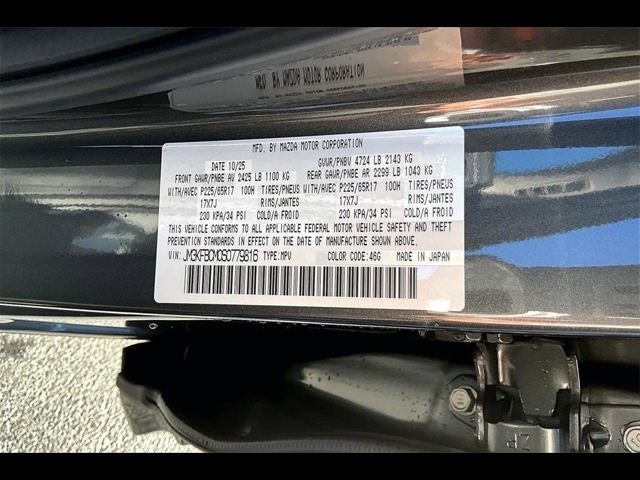 4-Wheel Disc Brakes, 6 Speakers, ABS brakes, Air Conditioning, All-Weather Floor Mats, Alloy wheels, AM/FM radio, AppLink/Apple CarPlay and Android Auto, Auto High-beam Headlights, Auto-dimming Rear-View mirror, Automatic temperature control, Brake assist, Bumpers: body-color, Cargo Net, Cargo Storage Shelf, Delay-off headlights, Driver door bin, Driver vanity mirror, Dual front impact airbags, Dual front side impact airbags, E911 Automatic Emergency Notification, Electronic Stability Control, Emergency communication system: MAZDA CONNECT, Exterior Parking Camera Rear, Four wheel independent suspension, Front & Rear Splash Guards, Front anti-roll bar, Front Bucket Seats, Front Center Armrest w/Storage, Front dual zone A/C, Front reading lights, Fully automatic headlights, Garage door transmitter: HomeLink, Heated Front Bucket Seats, Heated front seats, Illuminated entry, Infotainment System Voice Command, Leather Seat Trim, Leather Shift Knob, Leather steering wheel, Low tire pressure warning, Machine Gray Metallic Paint, Memory seat, Multifunction Commander Control, Occupant sensing airbag, Outside temperature display, Overhead airbag, Overhead console, Pandora, Panic alarm, Passenger door bin, Passenger vanity mirror, Power door mirrors, Power driver seat, Power Liftgate, Power moonroof, Power passenger seat, Power steering, Power windows, Radio Broadcast Data System Program Information, Radio data system, Radio: AM/FM/HD Audio System, Rain sensing wipers, Rear anti-roll bar, Rear reading lights, Rear seat center armrest, Rear window defroster, Rear window wiper, Remote keyless entry, SMS Text Msg Audio Delivery & Reply, Speed control, Speed-sensing steering, Split folding rear seat, Spoiler, Steering wheel mounted audio controls, Tachometer, Telescoping steering wheel, Tilt steering wheel, Traction control, Trip computer, Turn signal indicator mirrors, Variably intermittent wipers, Wheel Locks, and Wheels: 17 x 7J Aluminum Alloy.