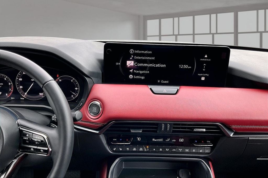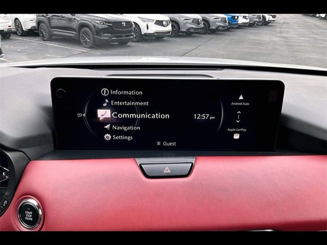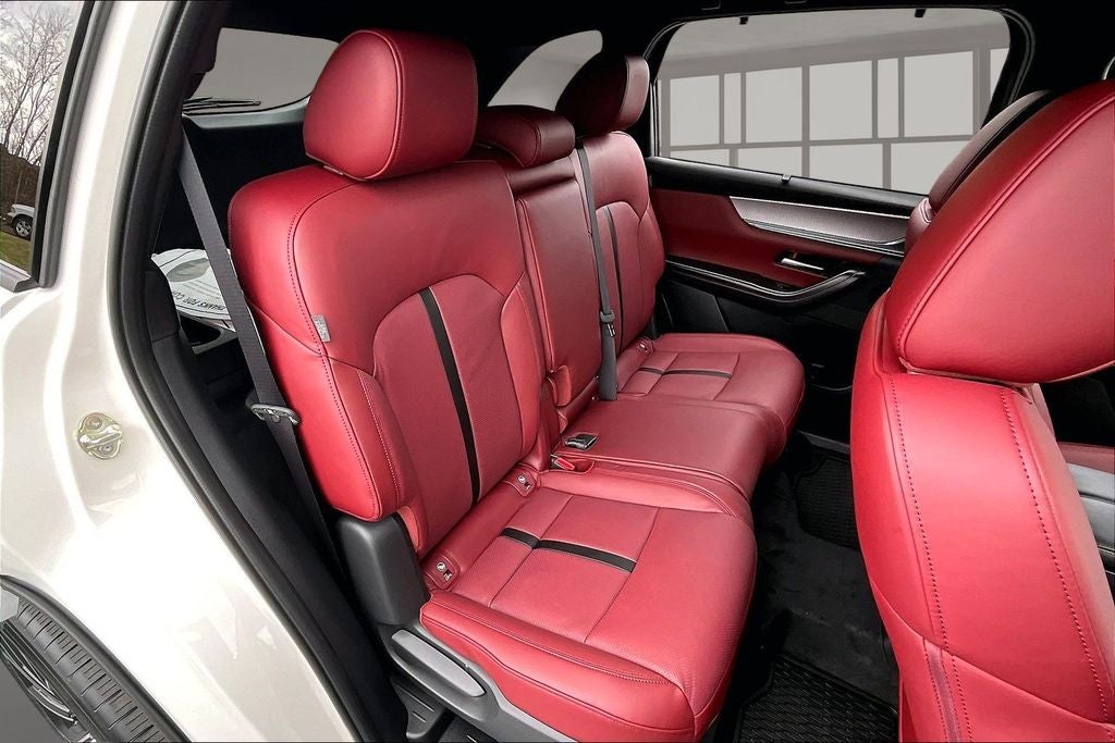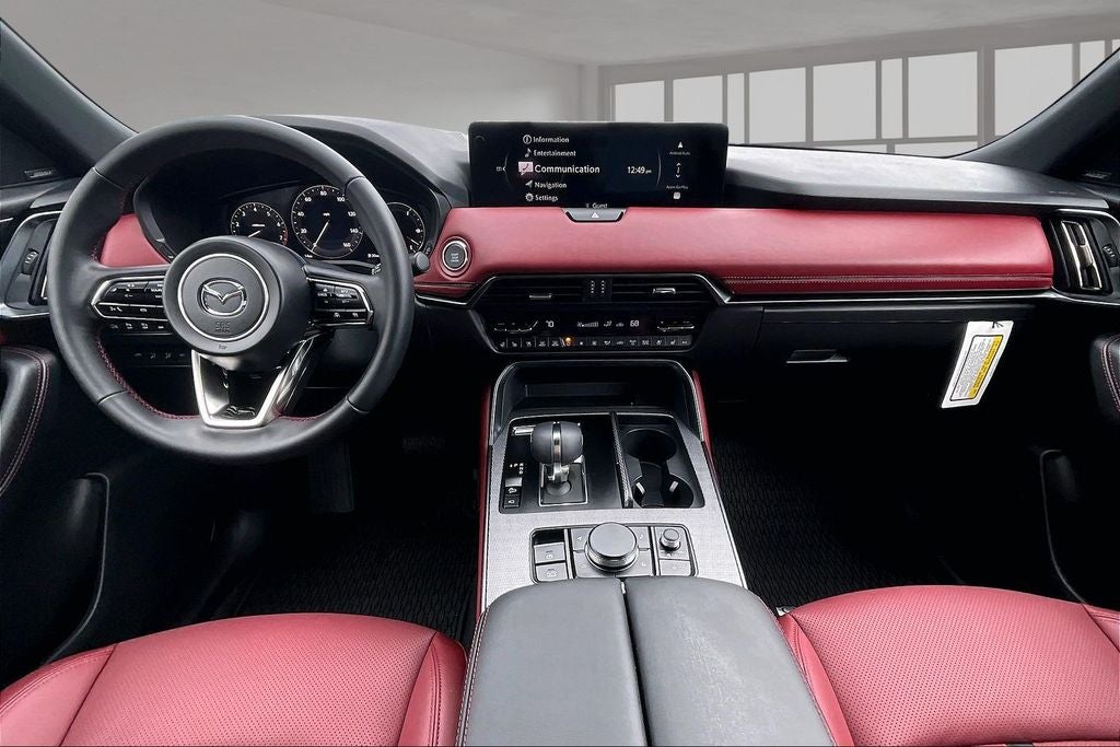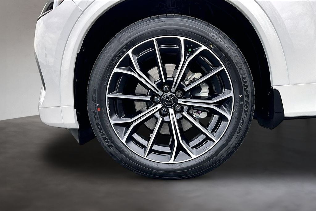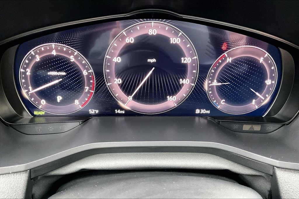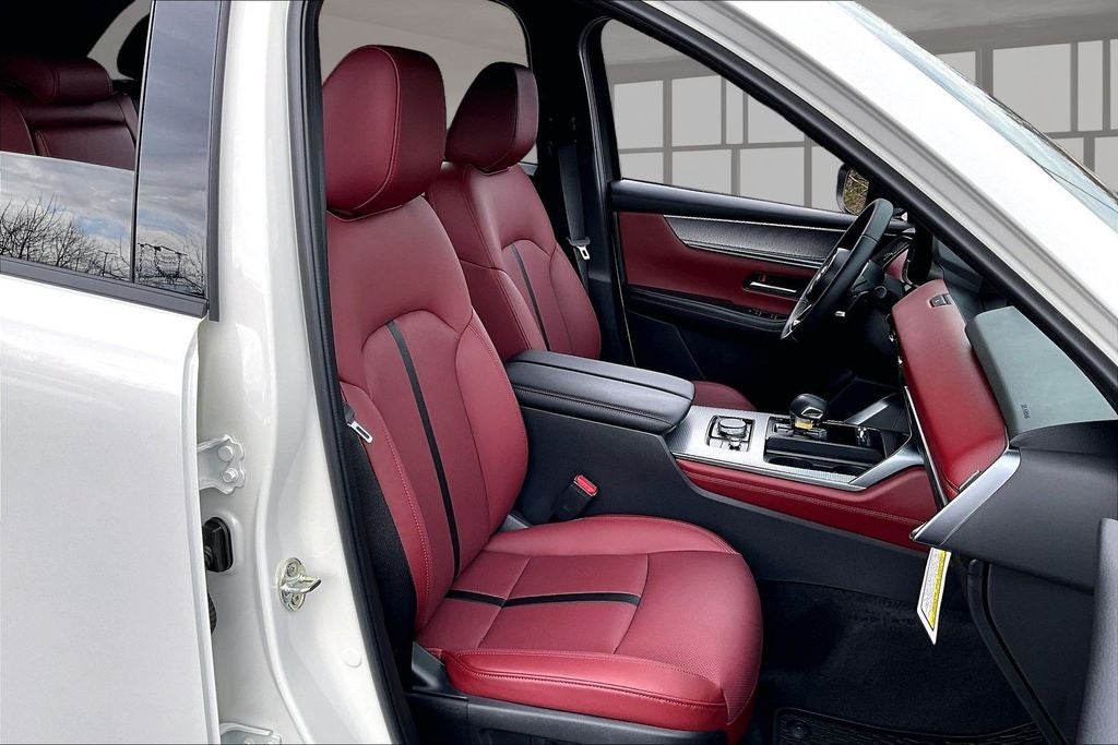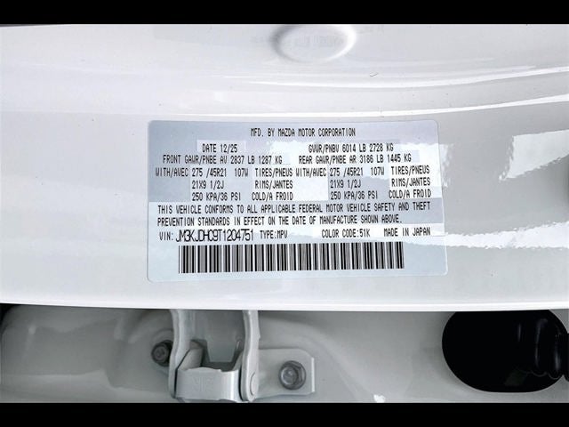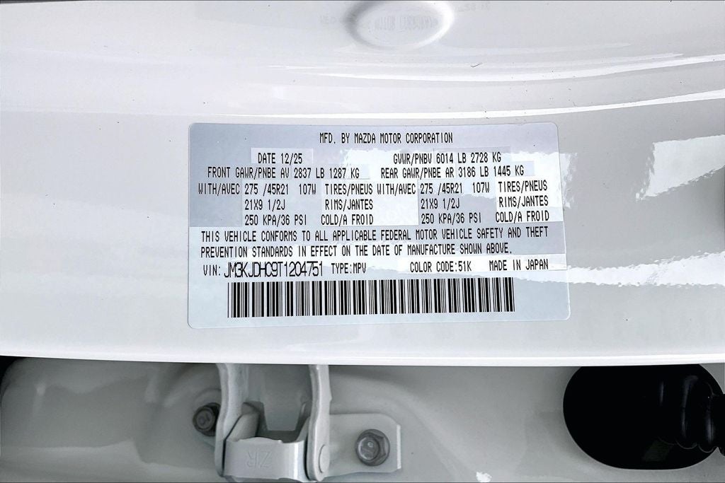 12 Speakers, 4-Wheel Disc Brakes, ABS brakes, Air Conditioning, Alloy wheels, AM/FM radio: SiriusXM, Auto High-beam Headlights, Auto-dimming door mirrors, Auto-dimming Rear-View mirror, Automatic temperature control, Black Cross Bars, Black Lug Nuts and Black Wheel Locks, Brake assist, Bumpers: body-color, Cargo Blocks, Compass, Delay-off headlights, Driver door bin, Driver vanity mirror, Dual front impact airbags, Dual front side impact airbags, E911 Automatic Emergency Notification, Electronic Stability Control, Emergency communication system: MAZDA CONNECT, Four wheel independent suspension, Front anti-roll bar, Front Bucket Seats, Front Center Armrest w/Storage, Front dual zone A/C, Front reading lights, Fully automatic headlights, Garage door transmitter: HomeLink, Heads-Up Display, Heated door mirrors, Heated front seats, Heated rear seats, Heated steering wheel, Heated/Ventilated Front Bucket Seats, Illuminated entry, Infotainment System Voice Command, Knee airbag, Leather Shift Knob, Leather steering wheel, Low tire pressure warning, Mazda Connected Services, Mazda Online Navigation, Memory seat, Nappa Leather Seat Trim, Navigation system: MAZDA CONNECT, Occupant sensing airbag, Outside temperature display, Overhead airbag, Overhead console, Panic alarm, Passenger door bin, Passenger vanity mirror, Power door mirrors, Power driver seat, Power Liftgate, Power moonroof, Power passenger seat, Power steering, Power windows, Radio Broadcast Data System Program Information, Radio data system, Radio: AM/FM with Bose Premium Audio Sound System, Rain sensing wipers, Rear air conditioning, Rear anti-roll bar, Rear reading lights, Rear seat center armrest, Rear window defroster, Rear window wiper, Remote keyless entry, Rhodium White Premium Paint Charge, Security system, SMS Text Message Audio Delivery and Reply, Speed control, Speed-sensing steering, Splash Guards, Split folding rear seat, Spoiler, Steering wheel memory, Steering wheel mounted audio controls, Tachometer, Telescoping steering wheel, Tilt steering wheel, Traction control, Trip computer, Turn signal indicator mirrors, Variably intermittent wipers, Ventilated front seats, and Wheels: 21 x 9.5J Aluminum Alloy.