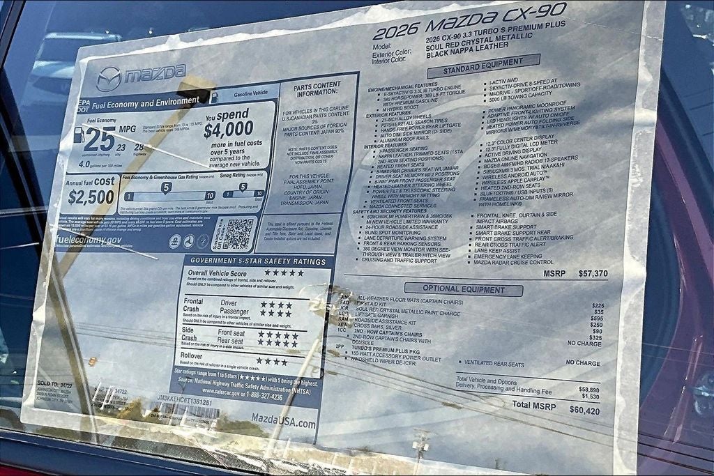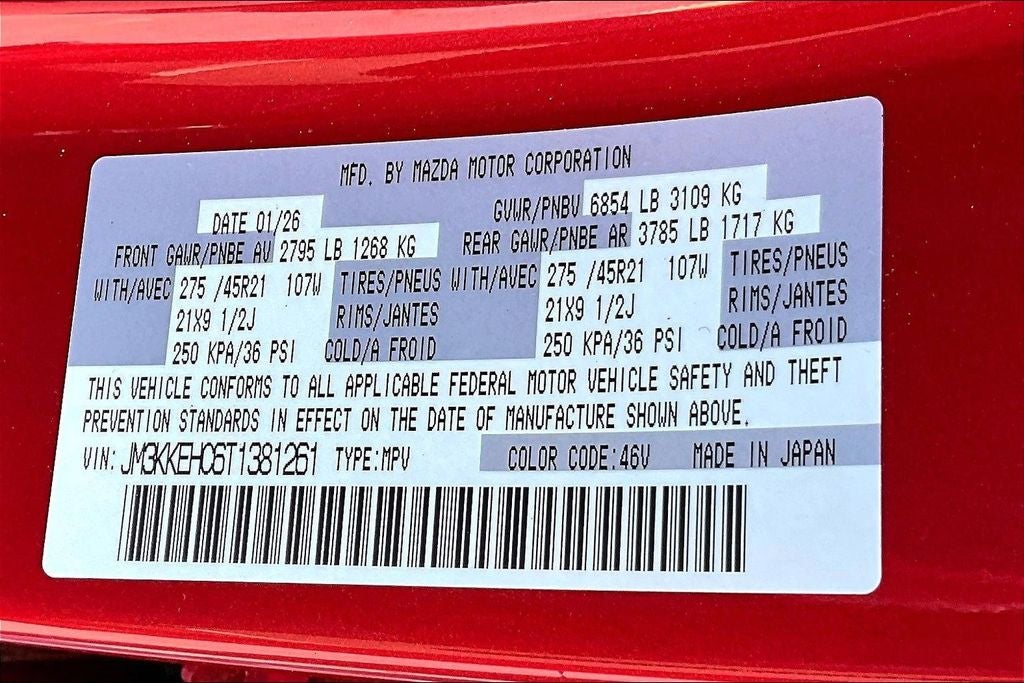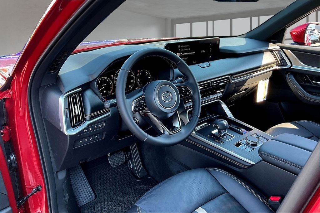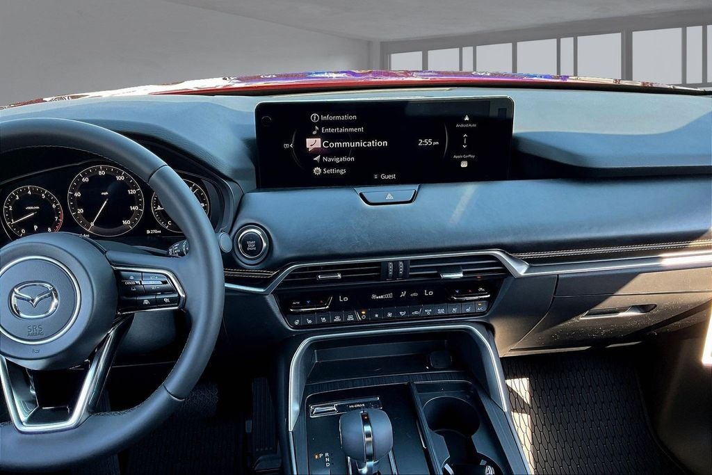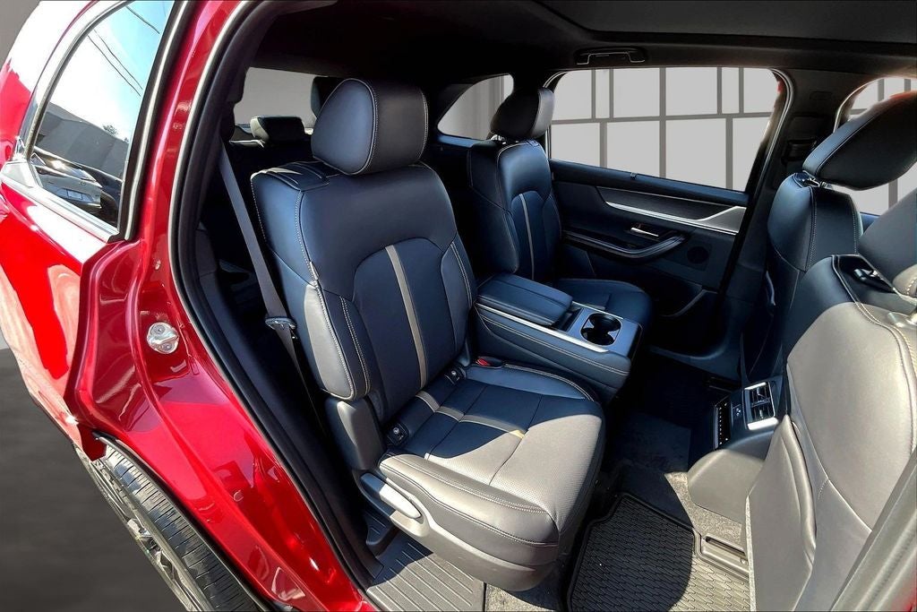 12 Speakers, 3rd row seats: bench, 4-Wheel Disc Brakes, ABS brakes, Air Conditioning, All Weather Floor Mats - Captains Chairs, Alloy wheels, AM/FM radio: SiriusXM, Auto High-beam Headlights, Auto-dimming door mirrors, Auto-dimming Rear-View mirror, Automatic temperature control, Brake assist, Bumpers: body-color, Compass, Cross Bars - Silver, Delay-off headlights, Driver door bin, Driver vanity mirror, Dual front impact airbags, Dual front side impact airbags, E911 Automatic Emergency Notification, Electronic Stability Control, Emergency communication system: MAZDA CONNECT, Four wheel independent suspension, Front anti-roll bar, Front Bucket Seats, Front Center Armrest w/Storage, Front dual zone A/C, Front reading lights, Fully automatic headlights, Garage door transmitter: HomeLink, Heads-Up Display, Heated door mirrors, Heated front seats, Heated rear seats, Heated steering wheel, Heated/Ventilated Front Bucket Seats, Illuminated entry, Infotainment System Voice Command, Knee airbag, Leather Shift Knob, Leather steering wheel, Low tire pressure warning, Mazda Connected Services, Mazda Online Navigation, Memory seat, Nappa Leather Seat Trim, Navigation system: MAZDA CONNECT, Occupant sensing airbag, Outside temperature display, Overhead airbag, Overhead console, Panic alarm, Passenger door bin, Passenger vanity mirror, Power door mirrors, Power driver seat, Power Liftgate, Power moonroof, Power passenger seat, Power steering, Power windows, Radio Broadcast Data System Program Information, Radio data system, Radio: : AM/FM w/HD/Bose 12-Speaker Sound System, Rain sensing wipers, Rear air conditioning, Rear anti-roll bar, Rear reading lights, Rear seat center armrest, Rear window defroster, Rear window wiper, Remote keyless entry, Security system, SMS Text Msg Audio Delivery and Reply, Soul Red Crystal Metallic Paint Charge, Speed control, Speed-sensing steering, Split folding rear seat, Spoiler, Steering wheel memory, Steering wheel mounted audio controls, Tachometer, Telescoping steering wheel, Tilt steering wheel, Traction control, Trip computer, Turn signal indicator mirrors, Variably intermittent wipers, Ventilated front seats, Ventilated rear seats, and Wheels: 21 x 9.5j Machine Cut Aluminum Alloy.