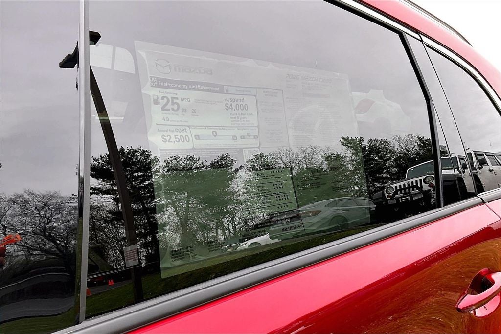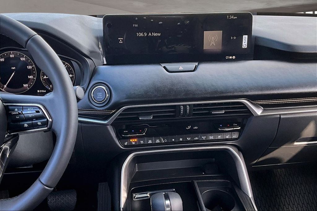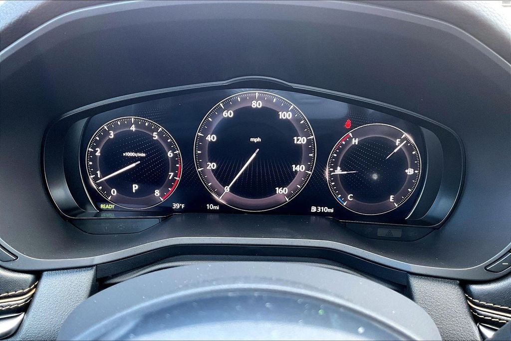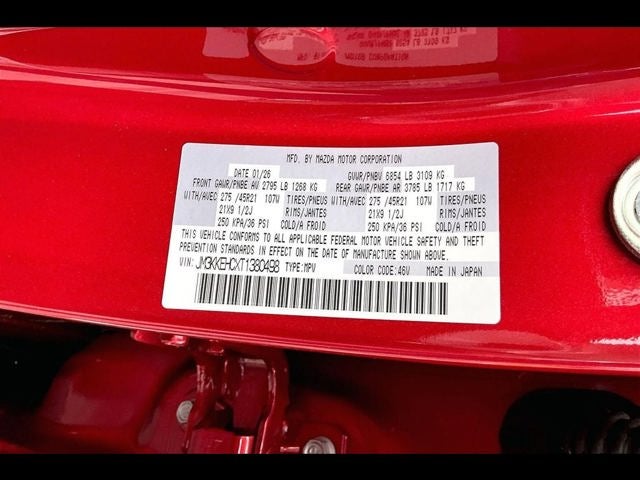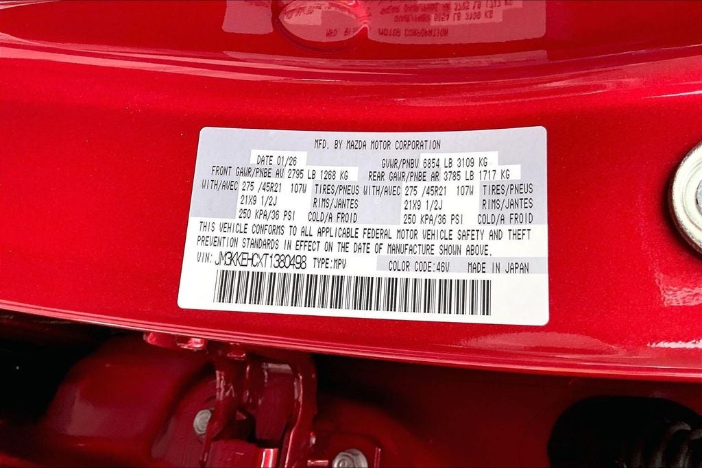 12 Speakers, 3rd row seats: bench, 4-Wheel Disc Brakes, ABS brakes, Air Conditioning, Alloy wheels, AM/FM radio: SiriusXM, Auto High-beam Headlights, Auto-dimming door mirrors, Auto-dimming Rear-View mirror, Automatic temperature control, Brake assist, Bumpers: body-color, Compass, Delay-off headlights, Driver door bin, Driver vanity mirror, Dual front impact airbags, Dual front side impact airbags, E911 Automatic Emergency Notification, Electronic Stability Control, Emergency communication system: MAZDA CONNECT, Four wheel independent suspension, Front anti-roll bar, Front Bucket Seats, Front Center Armrest w/Storage, Front dual zone A/C, Front reading lights, Fully automatic headlights, Garage door transmitter: HomeLink, Heads-Up Display, Heated door mirrors, Heated front seats, Heated rear seats, Heated steering wheel, Heated/Ventilated Front Bucket Seats, Illuminated entry, Infotainment System Voice Command, Knee airbag, Leather Shift Knob, Leather steering wheel, Low tire pressure warning, Mazda Connected Services, Mazda Online Navigation, Memory seat, Nappa Leather Seat Trim, Navigation system: MAZDA CONNECT, Occupant sensing airbag, Outside temperature display, Overhead airbag, Overhead console, Panic alarm, Passenger door bin, Passenger vanity mirror, Power door mirrors, Power driver seat, Power Liftgate, Power moonroof, Power passenger seat, Power steering, Power windows, Radio Broadcast Data System Program Information, Radio data system, Radio: : AM/FM w/HD/Bose 12-Speaker Sound System, Rain sensing wipers, Rear air conditioning, Rear anti-roll bar, Rear reading lights, Rear seat center armrest, Rear window defroster, Rear window wiper, Remote keyless entry, Security system, SMS Text Msg Audio Delivery and Reply, Soul Red Crystal Metallic Paint Charge, Speed control, Speed-sensing steering, Split folding rear seat, Spoiler, Steering wheel memory, Steering wheel mounted audio controls, Tachometer, Telescoping steering wheel, Tilt steering wheel, Traction control, Trip computer, Turn signal indicator mirrors, Variably intermittent wipers, Ventilated front seats, Ventilated rear seats, and Wheels: 21 x 9.5j Machine Cut Aluminum Alloy.
