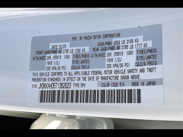 3rd row seats: bench, 4-Wheel Disc Brakes, 8 Speakers, ABS brakes, Air Conditioning, All Weather Floor Mats - Bench Seat, Alloy wheels, AM/FM radio, AppLink/Apple CarPlay and Android Auto, Auto High-beam Headlights, Automatic temperature control, Brake assist, Bumpers: body-color, Cargo Blocks, Compass, Delay-off headlights, Driver door bin, Driver vanity mirror, Dual front impact airbags, Dual front side impact airbags, E911 Automatic Emergency Notification, Electronic Stability Control, Emergency communication system: MAZDA CONNECT, Exterior Parking Camera Rear, Four wheel independent suspension, Front anti-roll bar, Front Bucket Seats, Front Center Armrest w/Storage, Front dual zone A/C, Front reading lights, Fully automatic headlights, Heated door mirrors, Illuminated entry, Infotainment System Voice Command, Knee airbag, Leather Shift Knob, Leather steering wheel, Leatherette Seat Trim, Low tire pressure warning, Mazda Connected Services, Occupant sensing airbag, Outside temperature display, Overhead airbag, Overhead console, Panic alarm, Passenger door bin, Passenger vanity mirror, Power door mirrors, Power driver seat, Power Liftgate, Power steering, Power windows, Radio Broadcast Data System Program Information, Radio data system, Radio: : AM/FM w/HD/8-Speaker Sound System, Rain sensing wipers, Rear air conditioning, Rear anti-roll bar, Rear reading lights, Rear seat center armrest, Rear window defroster, Rear window wiper, Remote keyless entry, Rhodium White Premium Paint Charge, SMS Text Msg Audio Delivery and Reply, Speed control, Speed-sensing steering, Split folding rear seat, Spoiler, Steering wheel mounted audio controls, Tachometer, Telescoping steering wheel, Tilt steering wheel, Traction control, Trip computer, Turn signal indicator mirrors, Variably intermittent wipers, Wheel Locks, and Wheels: 19 x 8.5J Aluminum Alloy with Silver Metallic Finish.