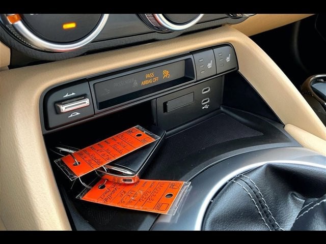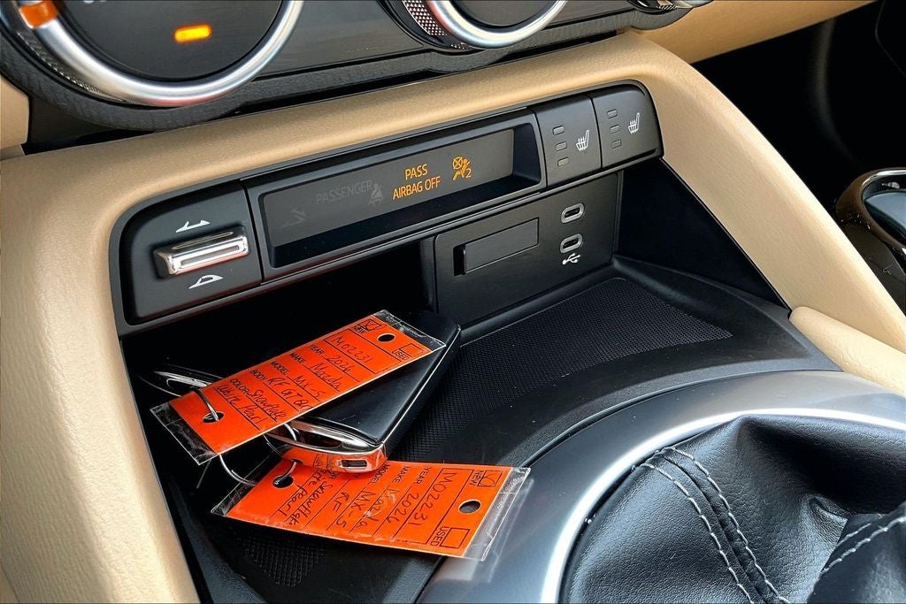 4-Wheel Disc Brakes, 9 Speakers, ABS brakes, Air Conditioning, Alloy wheels, AM/FM radio: SiriusXM, AppLink/Apple CarPlay and Android Auto, Auto High-beam Headlights, Auto-dimming door mirrors, Auto-dimming Rear-View mirror, Automatic temperature control, Black Lug Nuts and Black Wheel Locks, Brake assist, Bumpers: body-color, Cargo Net, Convertible HardTop, Convertible roof lining, Convertible roof wind blocker, Delay-off headlights, Driver vanity mirror, Dual front impact airbags, Dual front side impact airbags, Electronic Stability Control, Emergency communication system: MAZDA CONNECT, Exterior Parking Camera Rear, Four wheel independent suspension, Front anti-roll bar, Front Bucket Seats, Front Center Armrest, Fully automatic headlights, Garage door transmitter: HomeLink, Glass rear window, Heated door mirrors, Heated Front Bucket Seats, Heated front seats, Illuminated entry, Leather Shift Knob, Leather Upholstery, Low tire pressure warning, MAZDA CONNECT Infotainment System, Navigation System, Occupant sensing airbag, Outside temperature display, Panic alarm, Passenger vanity mirror, Power convertible roof, Power door mirrors, Power steering, Power windows, Radio data system, Radio: Bose Audio System with Audiopilot, Rain sensing wipers, Rear anti-roll bar, Rear window defroster, Remote keyless entry, Speed control, Speed-sensing steering, Sport steering wheel, Steering wheel mounted audio controls, Tachometer, Telescoping steering wheel, Tilt steering wheel, Traction control, Trip computer, Variably intermittent wipers, and Wheels: 17 x 7 Aluminum Alloy with Black Metallic Finish.