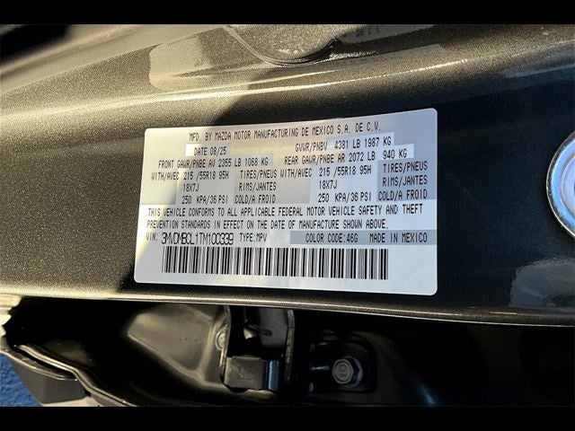 4-Wheel Disc Brakes, 8 Speakers, ABS brakes, Air Conditioning, Alloy wheels, AM/FM radio, AppLink/Apple CarPlay and Android Auto, Auto High-beam Headlights, Automatic temperature control, Brake assist, Bumpers: body-color, Cargo Tray, Compass, Delay-off headlights, Driver door bin, Driver vanity mirror, Dual front impact airbags, Dual front side impact airbags, Electronic Stability Control, Emergency communication system: MAZDA CONNECT, Exterior Parking Camera Rear, Front anti-roll bar, Front Bucket Seats, Front Center Armrest, Front dual zone A/C, Front reading lights, Front wheel independent suspension, Fully automatic headlights, Heated door mirrors, Heated Front Bucket Seats, Heated front seats, High Wall All-Weather Floor Mats, Illuminated entry, Knee airbag, Leather Shift Knob, Leather steering wheel, Leatherette Seat Trim, Low tire pressure warning, Machine Gray Metallic Paint Charge, MAZDA CONNECT Infotainment System, Memory seat, Occupant sensing airbag, Outside temperature display, Overhead airbag, Overhead console, Panic alarm, Passenger door bin, Passenger vanity mirror, Power door mirrors, Power driver seat, Power moonroof, Power steering, Power windows, Radio data system, Radio: AM/FM Audio System, Rain sensing wipers, Rear seat center armrest, Rear side impact airbag, Rear window defroster, Rear window wiper, Remote keyless entry, Speed control, Speed-sensing steering, Split folding rear seat, Spoiler, Stainless Steel Rear Bumper Guard, Steering wheel mounted audio controls, Tachometer, Telescoping steering wheel, Tilt steering wheel, Traction control, Trip computer, Turn signal indicator mirrors, Variably intermittent wipers, Wheel Locks, and Wheels: 18 x 7J Aluminum Alloy.