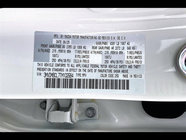 4-Wheel Disc Brakes, 8 Speakers, ABS brakes, Air Conditioning, Alloy wheels, AM/FM radio, AppLink/Apple CarPlay and Android Auto, Auto High-beam Headlights, Automatic temperature control, Brake assist, Bumpers: body-color, Cargo Tray, Compass, Delay-off headlights, Driver door bin, Driver vanity mirror, Dual front impact airbags, Dual front side impact airbags, Electronic Stability Control, Emergency communication system: MAZDA CONNECT, Exterior Parking Camera Rear, Front anti-roll bar, Front Bucket Seats, Front Center Armrest, Front dual zone A/C, Front reading lights, Front wheel independent suspension, Fully automatic headlights, Heated door mirrors, Heated Front Bucket Seats, Heated front seats, High Wall All-Weather Floor Mats, Illuminated entry, Knee airbag, Leather Shift Knob, Leather steering wheel, Leatherette Seat Trim, Low tire pressure warning, MAZDA CONNECT Infotainment System, Memory seat, Occupant sensing airbag, Outside temperature display, Overhead airbag, Overhead console, Panic alarm, Passenger door bin, Passenger vanity mirror, Power door mirrors, Power driver seat, Power moonroof, Power steering, Power windows, Radio data system, Radio: AM/FM Audio System, Rain sensing wipers, Rear seat center armrest, Rear side impact airbag, Rear window defroster, Rear window wiper, Remote keyless entry, Snowflake White Pearl Mica Paint Charge, Speed control, Speed-sensing steering, Split folding rear seat, Spoiler, Stainless Steel Rear Bumper Guard, Steering wheel mounted audio controls, Tachometer, Telescoping steering wheel, Tilt steering wheel, Traction control, Trip computer, Turn signal indicator mirrors, Variably intermittent wipers, Wheel Locks, and Wheels: 18 x 7J Aluminum Alloy.