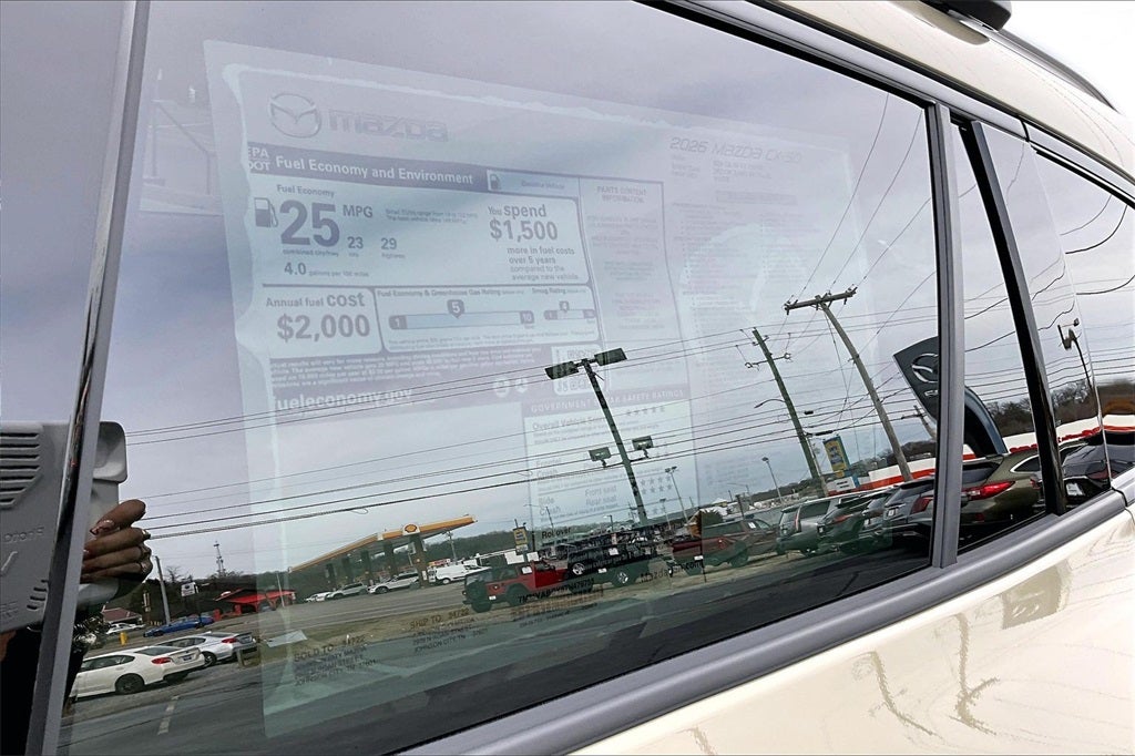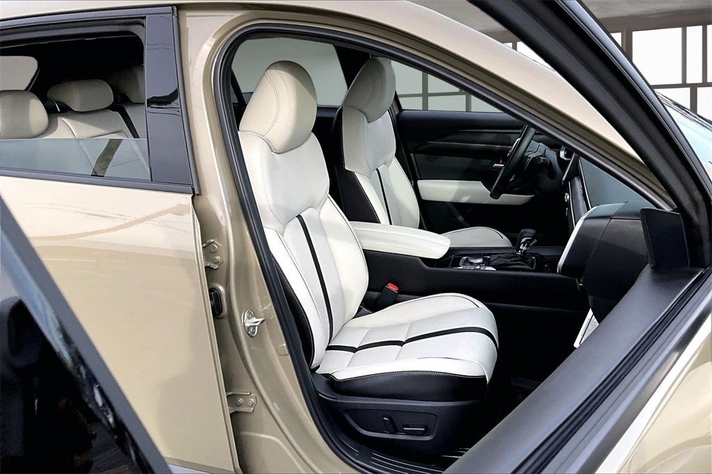 Weather Package, 12 Speakers, 4-Wheel Disc Brakes, ABS brakes, Air Conditioning, Alloy wheels, AM/FM radio: SiriusXM, AppLink/Apple CarPlay and Android Auto, Auto High-beam Headlights, Auto-dimming Rear-View mirror, Automatic temperature control, Brake assist, Bumpers: body-color, Delay-off headlights, Driver door bin, Driver vanity mirror, Dual front impact airbags, Dual front side impact airbags, Electronic Stability Control, Emergency communication system: MAZDA CONNECT, Exterior Parking Camera Rear, Front anti-roll bar, Front Bucket Seats, Front Center Armrest, Front dual zone A/C, Front reading lights, Front wheel independent suspension, Fully automatic headlights, Garage door transmitter: HomeLink, Heads-Up Display, Heated and Ventilated Front Seats with 3 Level Adjustment, Heated door mirrors, Heated front seats, Illuminated entry, Knee airbag, Leather Seat Trim, Leather Shift Knob, Leather steering wheel, Low tire pressure warning, Memory seat, Occupant sensing airbag, Outside temperature display, Overhead airbag, Overhead console, Panic alarm, Passenger door bin, Passenger vanity mirror, Power door mirrors, Power driver seat, Power Liftgate, Power moonroof, Power passenger seat, Power steering, Power windows, Radio data system, Radio: AM/FM/HD Bose 12-Speaker Audio Sound System, Rain sensing wipers, Rear seat center armrest, Rear window defroster, Rear window wiper, Remote keyless entry, Silver Cross Bars, Speed control, Speed-sensing steering, Split folding rear seat, Spoiler, Steering wheel mounted audio controls, Tachometer, Telescoping steering wheel, Tilt steering wheel, Traction control, Trip computer, Turn signal indicator mirrors, Variably intermittent wipers, Ventilated front seats, Wheels: 20 x 8J Aluminum Alloy Black Metallic with Machining Cut, and Zircon Sand Metallic and White Interior.