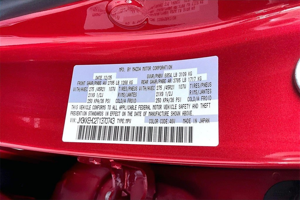 12 Speakers, 3rd row seats: bench, 4-Wheel Disc Brakes, ABS brakes, Air Conditioning, Alloy wheels, AM/FM radio: SiriusXM, Auto High-beam Headlights, Auto-dimming door mirrors, Auto-dimming Rear-View mirror, Automatic temperature control, Brake assist, Bumpers: body-color, Cargo Blocks, Compass, Delay-off headlights, Driver door bin, Driver vanity mirror, Dual front impact airbags, Dual front side impact airbags, E911 Automatic Emergency Notification, Electronic Stability Control, Emergency communication system: MAZDA CONNECT, Four wheel independent suspension, Front anti-roll bar, Front Bucket Seats, Front Center Armrest w/Storage, Front dual zone A/C, Front reading lights, Fully automatic headlights, Garage door transmitter: HomeLink, Heads-Up Display, Heated door mirrors, Heated front seats, Heated rear seats, Heated steering wheel, Heated/Ventilated Front Bucket Seats, Illuminated entry, Infotainment System Voice Command, Knee airbag, Leather Shift Knob, Leather steering wheel, Low tire pressure warning, Mazda Connected Services, Mazda Online Navigation, Memory seat, Nappa Leather Seat Trim, Navigation system: MAZDA CONNECT, Occupant sensing airbag, Outside temperature display, Overhead airbag, Overhead console, Panic alarm, Passenger door bin, Passenger vanity mirror, Power door mirrors, Power driver seat, Power Liftgate, Power moonroof, Power passenger seat, Power steering, Power windows, Radio Broadcast Data System Program Information, Radio data system, Radio: : AM/FM w/HD/Bose 12-Speaker Sound System, Rain sensing wipers, Rear air conditioning, Rear anti-roll bar, Rear reading lights, Rear seat center armrest, Rear window defroster, Rear window wiper, Remote keyless entry, Security system, SMS Text Msg Audio Delivery and Reply, Soul Red Crystal Metallic Paint Charge, Speed control, Speed-sensing steering, Split folding rear seat, Spoiler, Steering wheel memory, Steering wheel mounted audio controls, Tachometer, Telescoping steering wheel, Tilt steering wheel, Traction control, Trip computer, Turn signal indicator mirrors, Variably intermittent wipers, Ventilated front seats, Ventilated rear seats, and Wheels: 21 x 9.5j Machine Cut Aluminum Alloy.