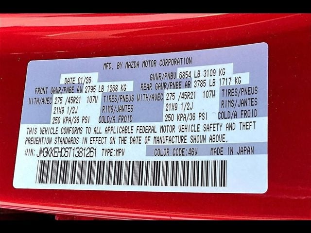 12 Speakers, 3rd row seats: bench, 4-Wheel Disc Brakes, ABS brakes, Air Conditioning, All Weather Floor Mats - Captains Chairs, Alloy wheels, AM/FM radio: SiriusXM, Auto High-beam Headlights, Auto-dimming door mirrors, Auto-dimming Rear-View mirror, Automatic temperature control, Brake assist, Bumpers: body-color, Compass, Cross Bars - Silver, Delay-off headlights, Driver door bin, Driver vanity mirror, Dual front impact airbags, Dual front side impact airbags, E911 Automatic Emergency Notification, Electronic Stability Control, Emergency communication system: MAZDA CONNECT, Four wheel independent suspension, Front anti-roll bar, Front Bucket Seats, Front Center Armrest w/Storage, Front dual zone A/C, Front reading lights, Fully automatic headlights, Garage door transmitter: HomeLink, Heads-Up Display, Heated door mirrors, Heated front seats, Heated rear seats, Heated steering wheel, Heated/Ventilated Front Bucket Seats, Illuminated entry, Infotainment System Voice Command, Knee airbag, Leather Shift Knob, Leather steering wheel, Low tire pressure warning, Mazda Connected Services, Mazda Online Navigation, Memory seat, Nappa Leather Seat Trim, Navigation system: MAZDA CONNECT, Occupant sensing airbag, Outside temperature display, Overhead airbag, Overhead console, Panic alarm, Passenger door bin, Passenger vanity mirror, Power door mirrors, Power driver seat, Power Liftgate, Power moonroof, Power passenger seat, Power steering, Power windows, Radio Broadcast Data System Program Information, Radio data system, Radio: : AM/FM w/HD/Bose 12-Speaker Sound System, Rain sensing wipers, Rear air conditioning, Rear anti-roll bar, Rear reading lights, Rear seat center armrest, Rear window defroster, Rear window wiper, Remote keyless entry, Security system, SMS Text Msg Audio Delivery and Reply, Soul Red Crystal Metallic Paint Charge, Speed control, Speed-sensing steering, Split folding rear seat, Spoiler, Steering wheel memory, Steering wheel mounted audio controls, Tachometer, Telescoping steering wheel, Tilt steering wheel, Traction control, Trip computer, Turn signal indicator mirrors, Variably intermittent wipers, Ventilated front seats, Ventilated rear seats, and Wheels: 21 x 9.5j Machine Cut Aluminum Alloy.