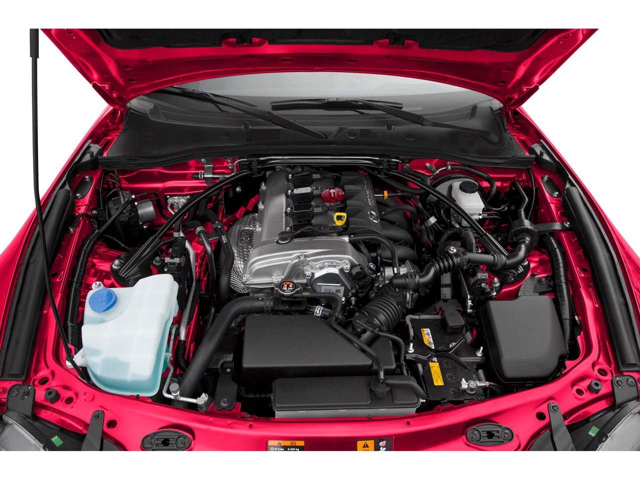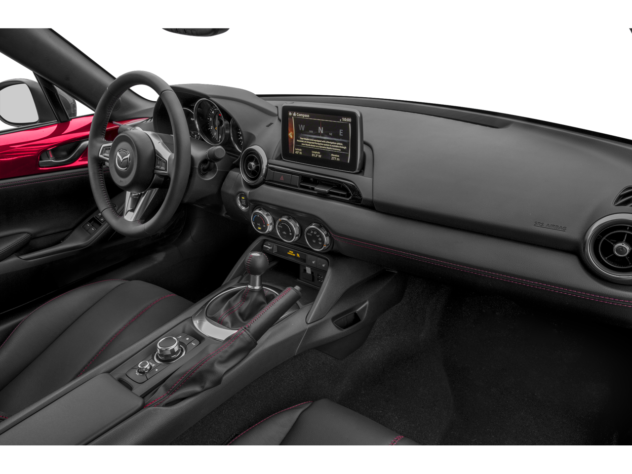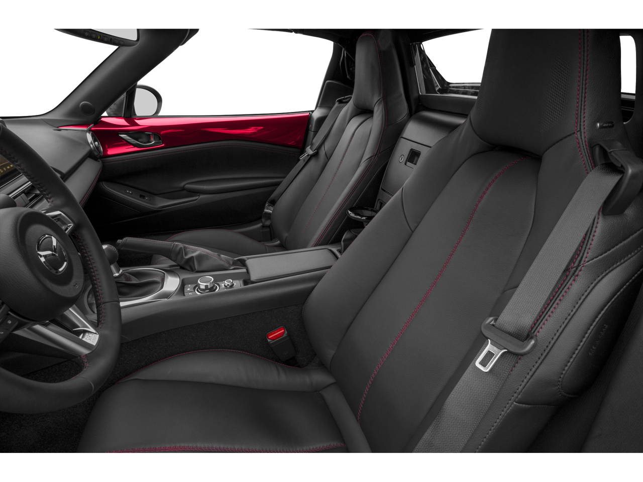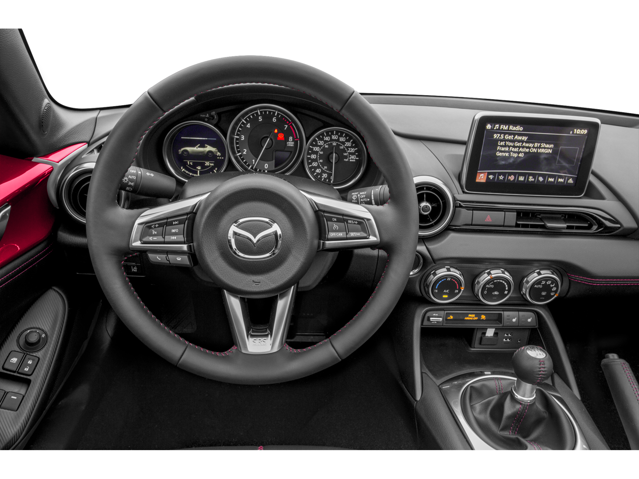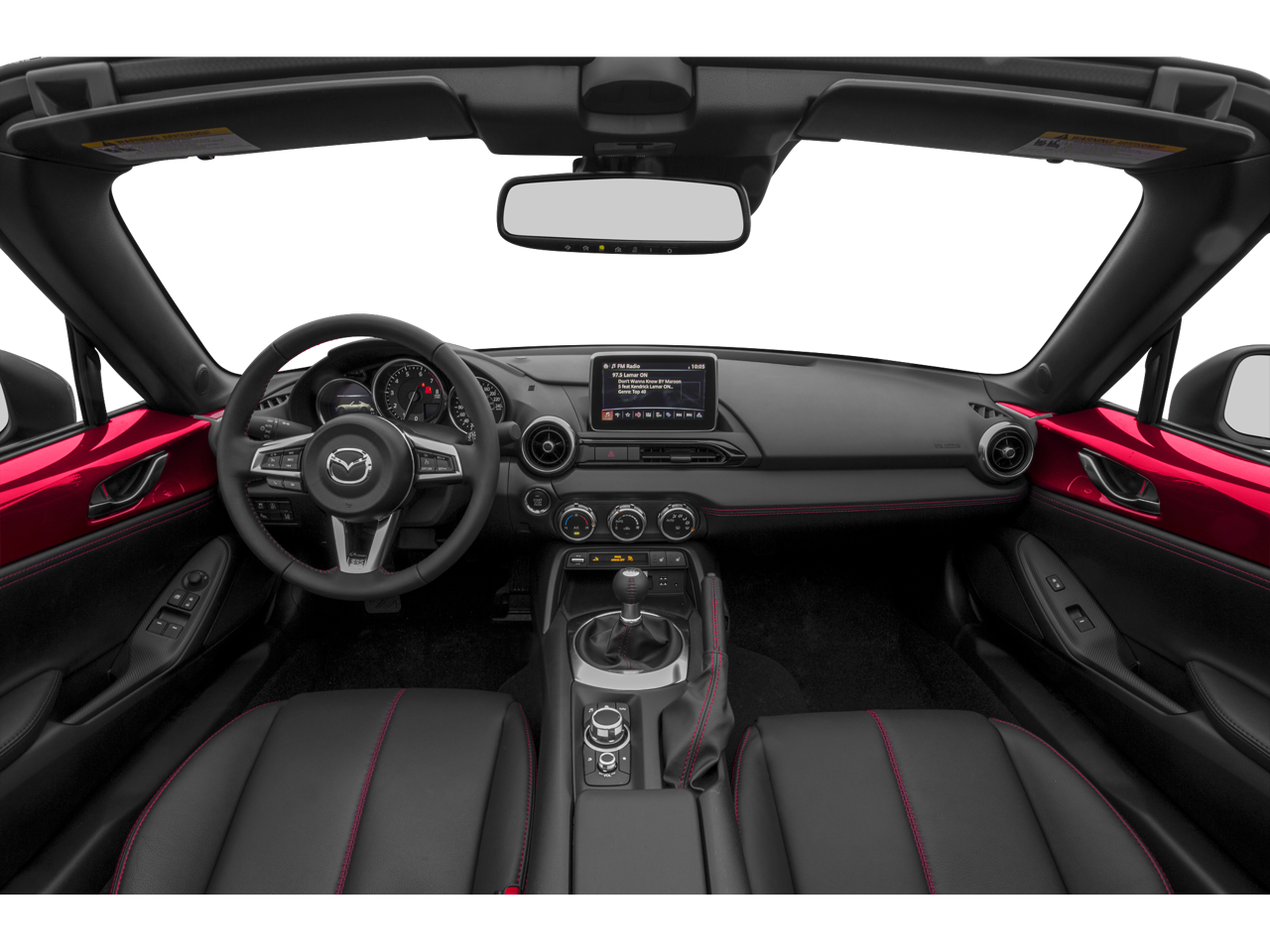 4-Wheel Disc Brakes, 9 Speakers, ABS brakes, Advanced Keyless Entry System, Air Conditioning, Alloy wheels, AM/FM radio: SiriusXM, Auto High-beam Headlights, Auto-dimming door mirrors, Auto-dimming Rear-View mirror, Automatic temperature control, Brake assist, Bumpers: body-color, CD player, Convertible HardTop, Convertible roof lining, Convertible roof wind blocker, Delay-off headlights, Driver vanity mirror, Dual front impact airbags, Dual front side impact airbags, Electronic Stability Control, Emergency communication system: Mazda Connect, Four wheel independent suspension, Front anti-roll bar, Front Bucket Seats, Front Center Armrest, Fully automatic headlights, Garage door transmitter: HomeLink, Glass rear window, Heated door mirrors, Heated Front Bucket Seats, Heated front seats, Illuminated entry, Leather Shift Knob, Leather Upholstery, Low tire pressure warning, Navigation system: MAZDA CONNECT, Occupant sensing airbag, Outside temperature display, Panic alarm, Passenger vanity mirror, Power convertible roof, Power door mirrors, Power steering, Power windows, Radio data system, Radio: AM/FM/HD w/Navigation & CD Player, Rain sensing wipers, Rear anti-roll bar, Rear window defroster, Remote keyless entry, Security system, Soul Red Metallic Paint Charge, Speed control, Speed-sensing steering, Sport steering wheel, Steering wheel mounted audio controls, Tachometer, Tilt steering wheel, Traction control, Trip computer, Variably intermittent wipers, and Wheels: 17 Dark Silver Alloy.
