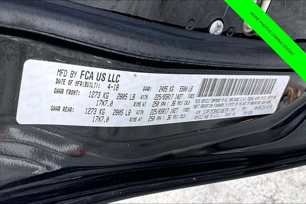 Popular Appearance Group (Deep Tint Sunscreen Glass), Quick Order Package 2BJ, 1-Year SiriusXM Radio Service, 3.734 Axle Ratio, 4-Wheel Disc Brakes, 6 Speakers, ABS brakes, Air Conditioning, AM/FM radio, Anti-whiplash front head restraints, Apple CarPlay/Android Auto, Brake assist, Bumpers: body-color, Cloth Bucket Seats, Compass, Delay-off headlights, Driver door bin, Driver vanity mirror, Dual front impact airbags, Dual front side impact airbags, Electronic Stability Control, For More Info, Call 800-643-2112, Four wheel independent suspension, Front anti-roll bar, Front Bucket Seats, Front Center Armrest, Front fog lights, Front reading lights, Fully automatic headlights, Heated door mirrors, Illuminated entry, Knee airbag, Low tire pressure warning, No Satellite Coverage HI/AK/PR/VI, Normal Duty Suspension, Occupant sensing airbag, Outside temperature display, Overhead airbag, Overhead console, Panic alarm, ParkView Rear Back-Up Camera, Passenger door bin, Passenger vanity mirror, Power door mirrors, Power steering, Power windows, Radio data system, Radio: Uconnect 4 w/7 Display, Rear anti-roll bar, Rear reading lights, Rear seat center armrest, Rear side impact airbag, Rear window defroster, Rear window wiper, Remote keyless entry, Roof rack: rails only, SiriusXM Satellite Radio, Speed control, Speed-sensing steering, Split folding rear seat, Spoiler, Stop-Start Multiple VSM System, Tachometer, Telescoping steering wheel, Tilt steering wheel, Traction control, Trip computer, Variably intermittent wipers, Voltmeter, and Wheels: 17 x 7 Painted Aluminum (DISC)
