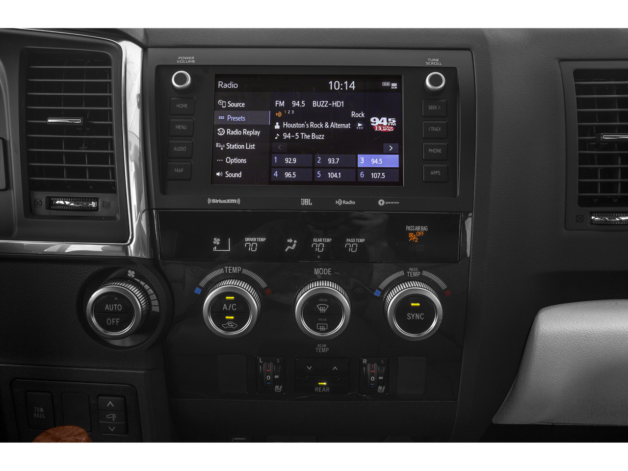 15 Speakers, 3rd row seats: split-bench, 4-Wheel Disc Brakes, 4.30 Axle Ratio, A/V remote, ABS brakes, Adaptive suspension, Air Conditioning, Alloy wheels, AM/FM radio: SiriusXM, Apple CarPlay/Android Auto, Auto High-beam Headlights, Auto tilt-away steering wheel, Auto-dimming door mirrors, Auto-dimming Rear-View mirror, Auto-leveling suspension, Automatic temperature control, Brake assist, Bumpers: body-color, Compass, Delay-off headlights, Driver door bin, Driver vanity mirror, Dual front impact airbags, Dual front side impact airbags, Electronic Stability Control, Emergency communication system: Safety Connect with 1-year trial, Exterior Parking Camera Rear, Four wheel independent suspension, Front anti-roll bar, Front Bucket Seats, Front Center Armrest, Front dual zone A/C, Front fog lights, Front Heated & Ventilated Bucket Seats, Front reading lights, Fully automatic headlights, Garage door transmitter: HomeLink, Headlight cleaning, Headphones, Heated door mirrors, Heated front seats, Heated rear seats, Illuminated entry, Knee airbag, Leather steering wheel, Low tire pressure warning, Memory seat, Navigation system: Dynamic Navigation (3-year trial), Occupant sensing airbag, Outside temperature display, Overhead airbag, Overhead console, Panic alarm, Passenger door bin, Passenger vanity mirror, Perforated Leather Seat Trim, Power door mirrors, Power driver seat, Power Liftgate, Power moonroof, Power passenger seat, Power steering, Power windows, Radio: Premium Audio w/Dynamic Navigation & JBL, Rear air conditioning, Rear anti-roll bar, Rear reading lights, Rear seat center armrest, Rear window defroster, Rear window wiper, Reclining 3rd row seat, Remote keyless entry, Roof rack, Security system, Speed control, Speed-sensing steering, Split folding rear seat, Spoiler, Steering wheel memory, Steering wheel mounted audio controls, Tachometer, Telescoping steering wheel, Tilt steering wheel, Traction control, Trip computer, Turn signal indicator mirrors, Two-Position Power Memory Driver's Seat, Variably intermittent wipers, Ventilated front seats, Voltmeter, and Wheels: 20 x 8 Machine Finish Split Spoke Alloy.