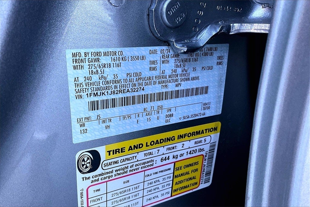 Equipment Group 202A High Package (110V/150W AC Power Outlet, 2nd Row Power-Folding Captain's Chairs, 3rd Row Vinyl Power-Folding Head Restraints, 4-Door Intelligent Access (Lock/Unlock), Accent Color Painted Rear Bumper, ActiveX-Trimmed 1st & 2nd Row Seats, Advanced Security Pack, Ambient Lighting, Heated Steering Wheel, Heated/Ventilated Front Seats, Power Liftgate, Power Tilt/Telescopic Steering Wheel w/Memory, Power-Adjustable Pedals w/Memory, Power-Folding Sideview Mirrors w/Autofold, Remote Start, SecuriCode Keyless Entry Keypad, and Wireless Charging Pad), Alloy wheels, Auto High-beam Headlights, Auto-dimming Rear-View mirror, Compass, Delay-off headlights, Emergency communication system: SYNC 4 911 Assist, Exterior Parking Camera Rear, Fully automatic headlights, Garage door transmitter, Heated door mirrors, Illuminated entry, Leather steering wheel, Navigation system: Connected Navigation, Occupant sensing airbag, Outside temperature display, Power door mirrors, Power driver seat, Power windows, Rear air conditioning, Rear window defroster, Rear window wiper, Reclining 3rd row seat, Remote keyless entry, Speed-sensing steering, Speed-Sensitive Wipers, Spoiler, Steering wheel mounted audio controls, SYNC 4 w/Enhanced Voice Recognition, Telescoping steering wheel, Tilt steering wheel, 18 Machined-Face Aluminum Wheels, 3.31 Axle Ratio, 3rd row seats: split-bench, 4-Wheel Disc Brakes, 6 Speakers, ABS brakes, Air Conditioning, AM/FM radio: SiriusXM with 360L, Automatic temperature control, Brake assist, Bumpers: body-color, Cloth Front Captain's Chairs, Driver door bin, Driver vanity mirror, Dual front impact airbags, Dual front side impact airbags, Electronic Stability Control, Four wheel independent suspension, Front anti-roll bar, Front Bucket Seats, Front Center Armrest, Front dual zone A/C, Front License Plate