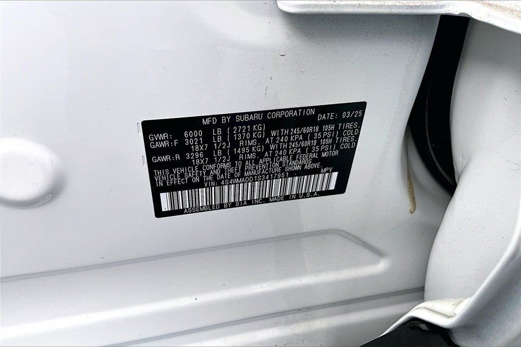 Standard Model, Alloy wheels, Apple CarPlay & Android Auto, Auto High-beam Headlights, Exterior Parking Camera Rear, Fully automatic headlights, Heated front seats, Illuminated entry, Power driver seat, Power Liftgate, Radio: Subaru 11.6 Multimedia Plus System, Steering wheel mounted audio controls, Telescoping steering wheel, Tilt steering wheel, 3rd row seats: bench, 4-Wheel Disc Brakes, 6 Speakers, ABS brakes, Air Conditioning, AM/FM radio: SiriusXM with 360L, Auto-dimming Rear-View mirror, Automatic temperature control, Brake assist, Bumpers: body-color, Compass, Delay-off headlights, Driver door bin, Driver vanity mirror, Dual front impact airbags, Dual front side impact airbags, Electronic Stability Control, Emergency communication system: MySubaru Safety (3-year free trial), Four wheel independent suspension, Front anti-roll bar, Front Bucket Seats, Front Center Armrest, Front dual zone A/C, Front reading lights, Garage door transmitter: HomeLink, Heated door mirrors, Heated Front Bucket Seats, Knee airbag, Leather Shift Knob, Leather steering wheel, Low tire pressure warning, Occupant sensing airbag, Outside temperature display, Overhead airbag, Overhead console, Panic alarm, Passenger door bin, Passenger vanity mirror, Power door mirrors, Power steering, Power windows, Radio data system, Rear air conditioning, Rear anti-roll bar, Rear reading lights, Rear window defroster, Rear window wiper, Reclining 3rd row seat, Remote keyless entry, Security system, Speed control, Speed-sensing steering, Spill Resistant Coated Cloth Upholstery, Split folding rear seat, Spoiler, Tachometer, Traction control, Trip computer, Turn signal indicator mirrors, Variably intermittent wipers, and Wheels: 18 x 7.5 J Gray Alloy w/Machine Finish.